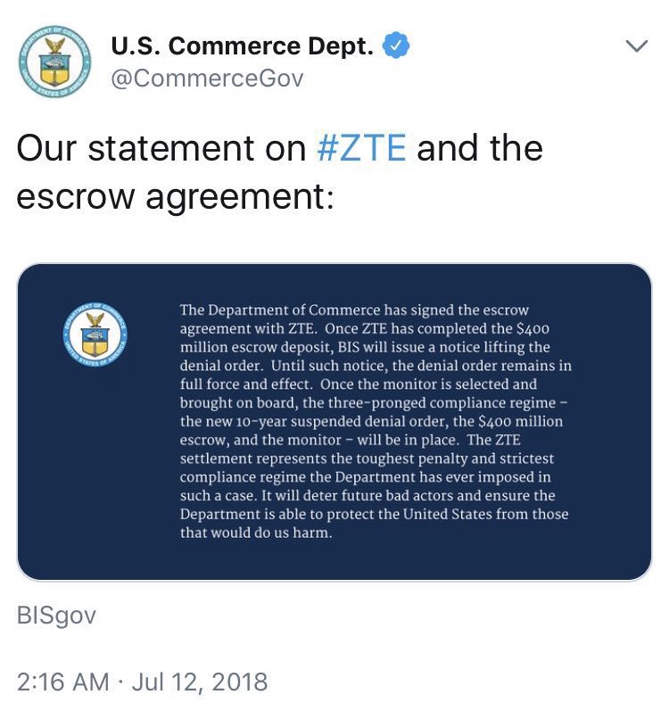 美国商务部推特上表示,周三签署的协议成立了一个代管账户,在中兴向这个账户注入4亿美元保证金之后,对于该公司的禁令将被解除。“一旦中兴通讯完成了4亿美元的托管押金,”美国商务部在一份声明中表示,它将“发出通知解除拒绝令”。